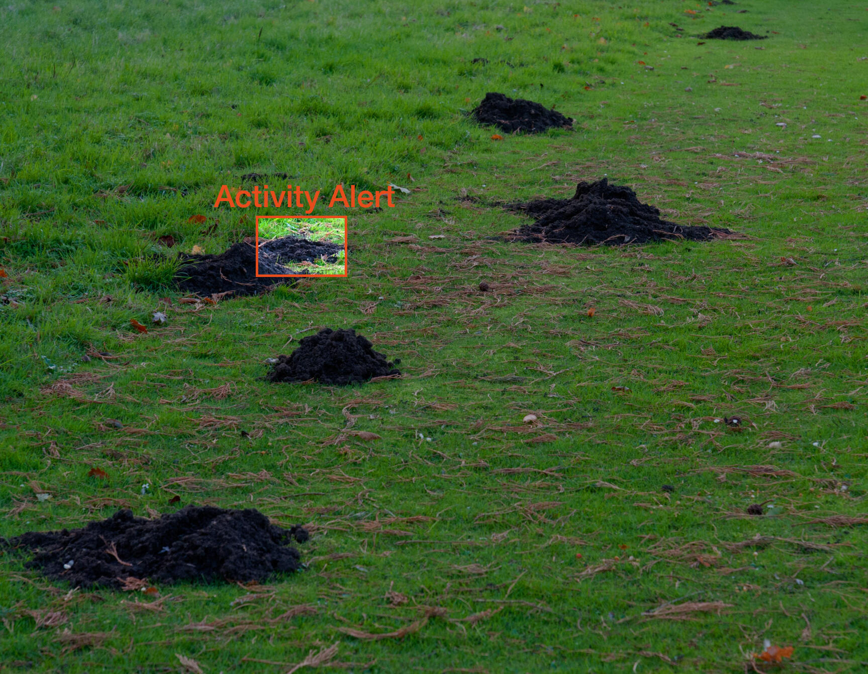 MoleShot's powerful vision AI constantly detects and alerts you of any new mole or gopher mounds. Use MoleShot's accurate alerts to keep your pristine field smooth, or to stop ongoing damage.